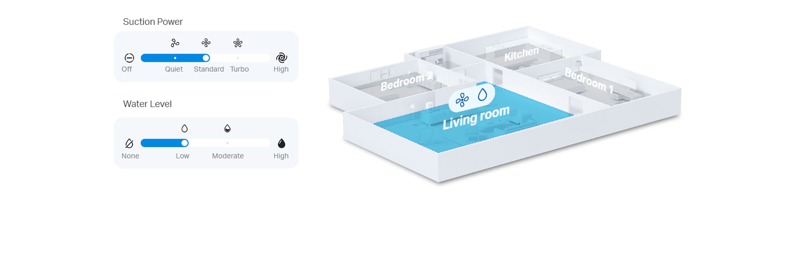 ادمج أو افصل المناطق، حدّد جداول التنظيف، واختر أوضاع التنظيف المناسبة لكل غرفة.