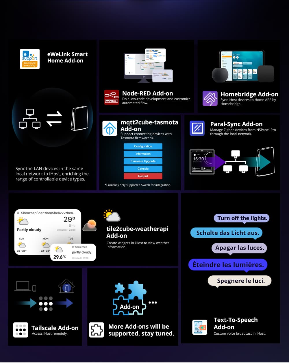 【مركز تحكم محلي】: يعمل iHost كمركز تحكم محلي ذكي، مما يجعل تجربة الأتمتة المنزليّة أسرع، أكثر موثوقية، وأكثر أماناً بعيداً عن الاعتماد الكلي على السحابة.