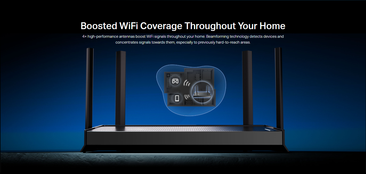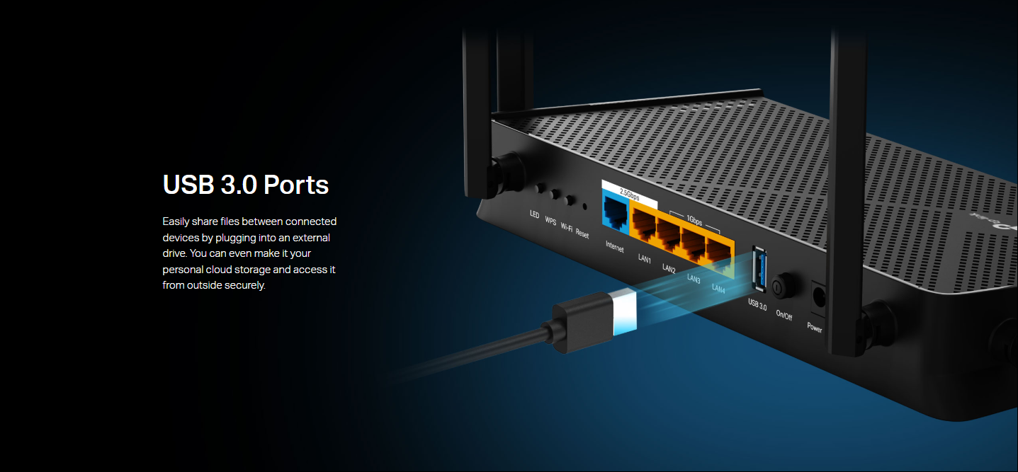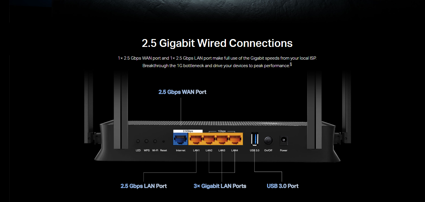 منافذ 2.5G مزدوجة: يحتوي على منفذ WAN بسرعة 2.5 جيجابت ومنفذ LAN بسرعة 2.5 جيجابت، مما يجعله مثالياً لاشتراكات الألياف البصرية فائقة السرعة وأجهزة التخزين الشبكي.