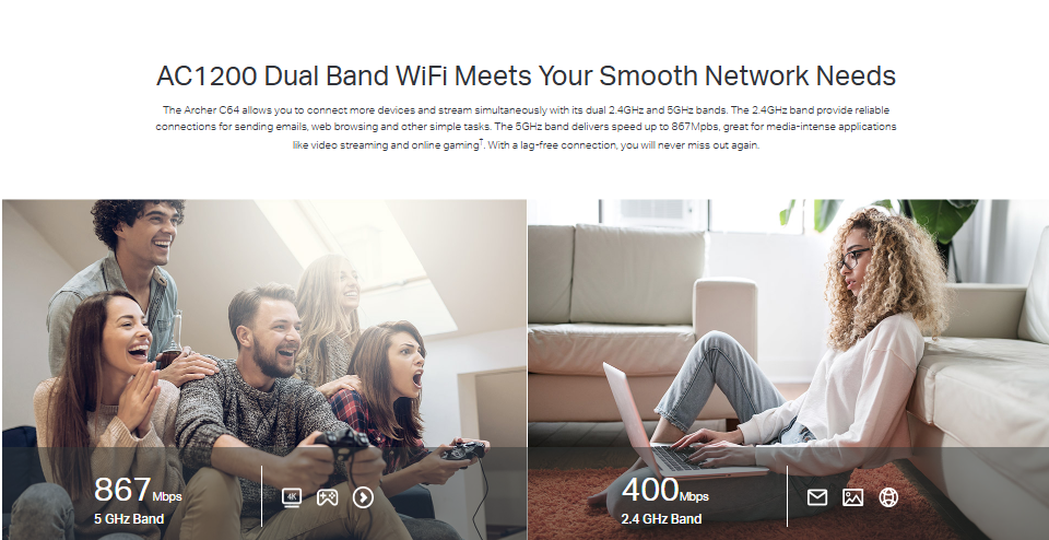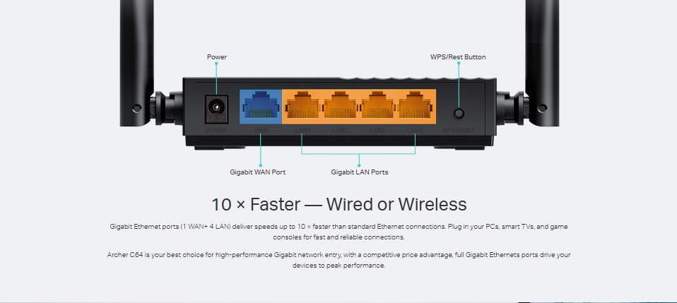 منافذ جيجابت كاملة: يضمن اتصالات سلكية فائقة السرعة والموثوقية لأجهزة الكمبيوتر، الشاشات الذكية، ومنصات الألعاب عبر 4 منافذ LAN ومنفذ WAN جميعها تدعم سرعة الجيجابت.