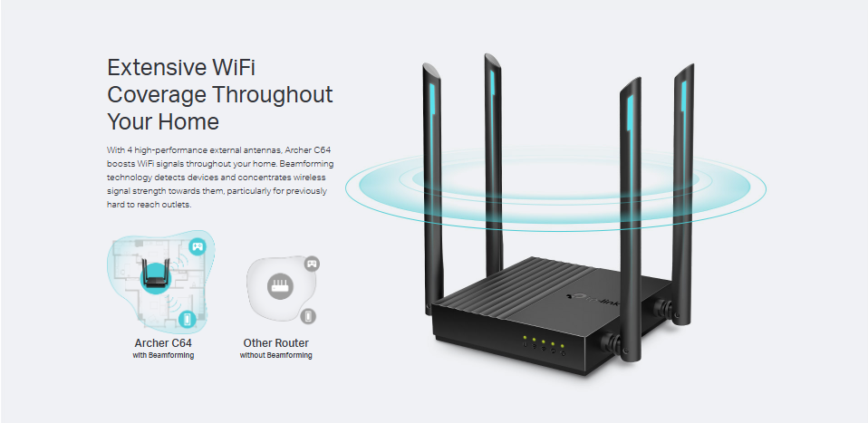 تغطية موسعة وقوية: 4 هوائيات خارجية عالية الأداء مع تقنية Beamforming تعمل معاً لتوسيع نطاق الإشارة وتغطية منزلك بالكامل بواي فاي مستقر.