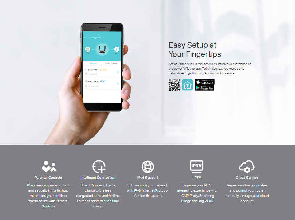 إدارة ذكية وبسيطة: يمكنك التحكم في إعدادات شبكتك بالكامل عبر تطبيق TP-Link Tether من هاتفك الذكي (أندرويد أو iOS) بكل سهولة.