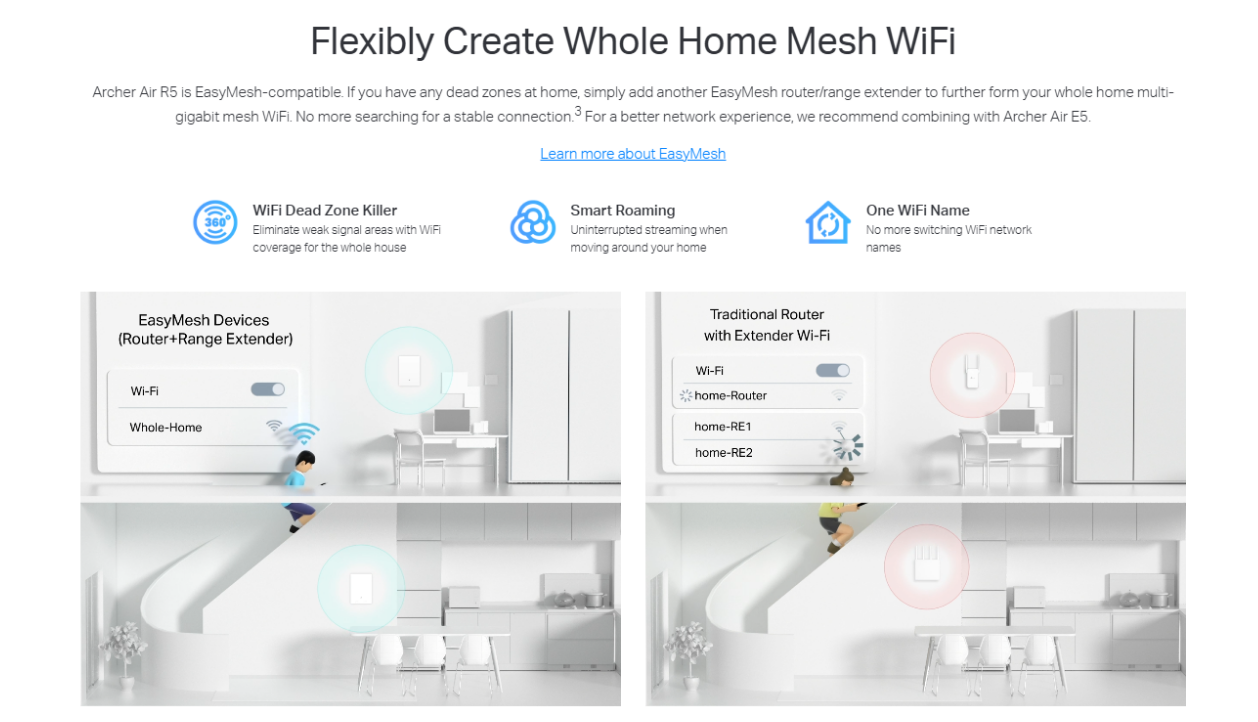 دعم تقنية EasyMesh: متوافق تماماً مع الراوترات التي تدعم EasyMesh، مما يتيح لك تكوين شبكة “Mesh” موحدة تغطي المنزل بالكامل وتمنع انقطاع الإشارة أثناء التنقل بين الغرف.