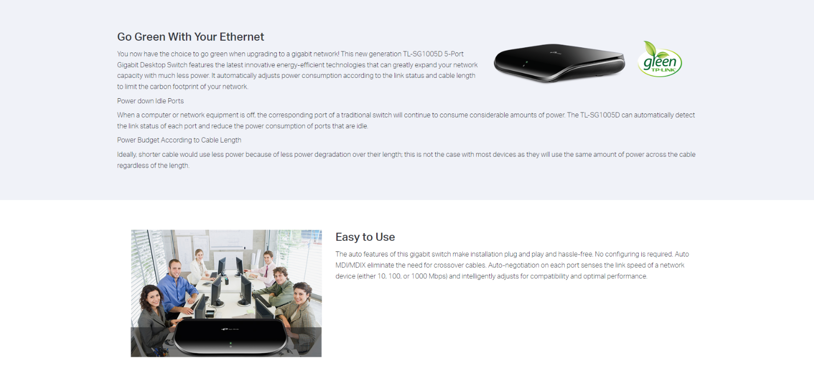 تقنية إيثرنت الخضراء (Green Tech): تقنية مبتكرة توفر ما يصل إلى 85% من استهلاك الطاقة، مما يجعله حلاً صديقاً للبيئة وموفراً للكهرباء لمنزلك أو مكتبك.