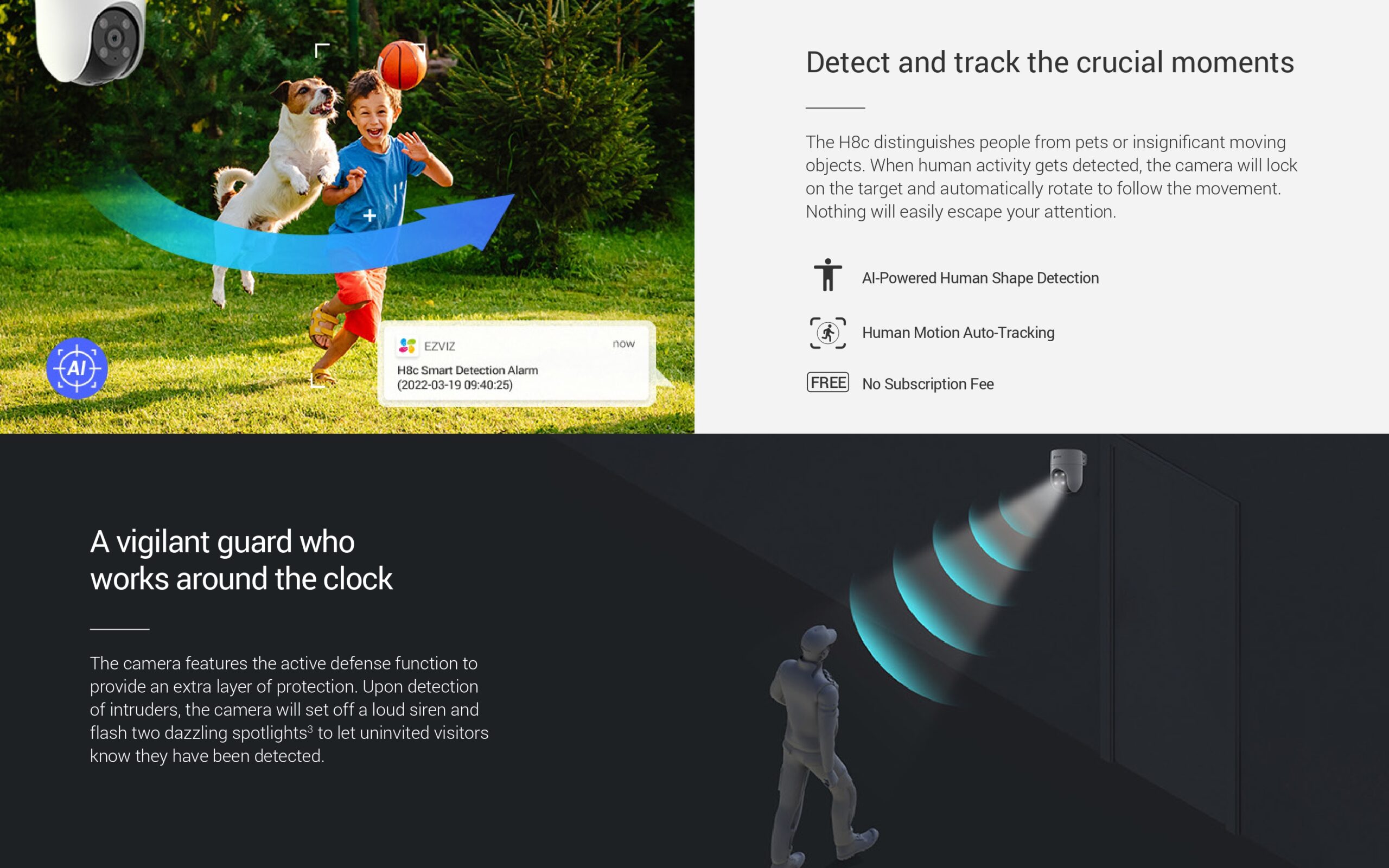 الدفاع النشط: تفعيل إنذار صوتي قوي وأربعة كشافات ضوئية عند رصد حركة لردع المتسللين.