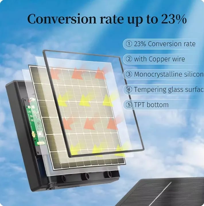 ☀️ خلايا سيليكون أحادية البلورية (Monocrystalline): يتميز بأعلى مستويات كفاءة التحويل الضوئي، مما يضمن لك شحناً سريعاً وفعالاً حتى في الأيام ذات الإضاءة المتوسطة.