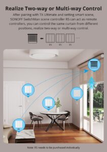 بوابة تحكم عن بُعد (eWeLink-Remote): يعمل الجهاز كبوابة تدعم وحدات التحكم الفرعية مثل R5، مما يتيح لك التحكم عن بُعد لمسافة تصل إلى 100 متر في المساحات المفتوحة، وتفعيل التحكم ثنائي الاتجاه أو المتعدد من أماكن مختلفة.