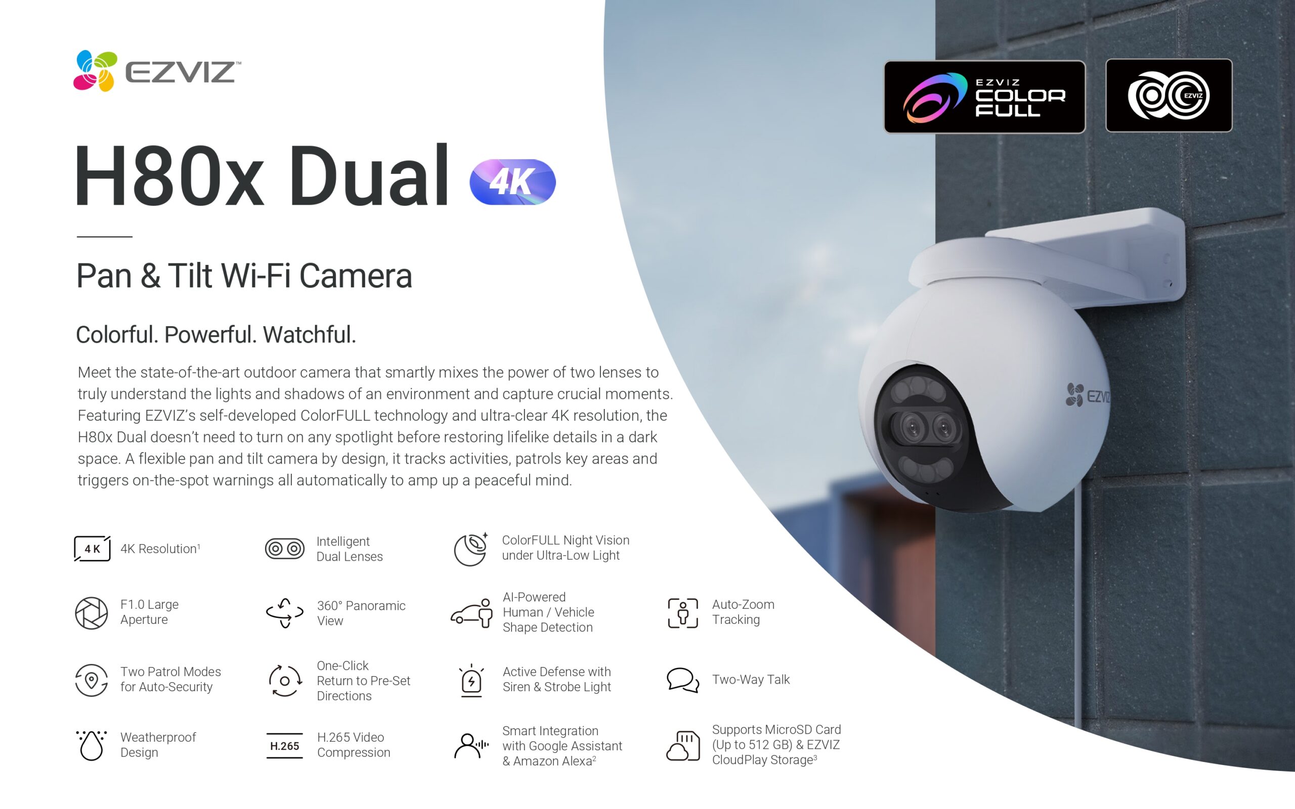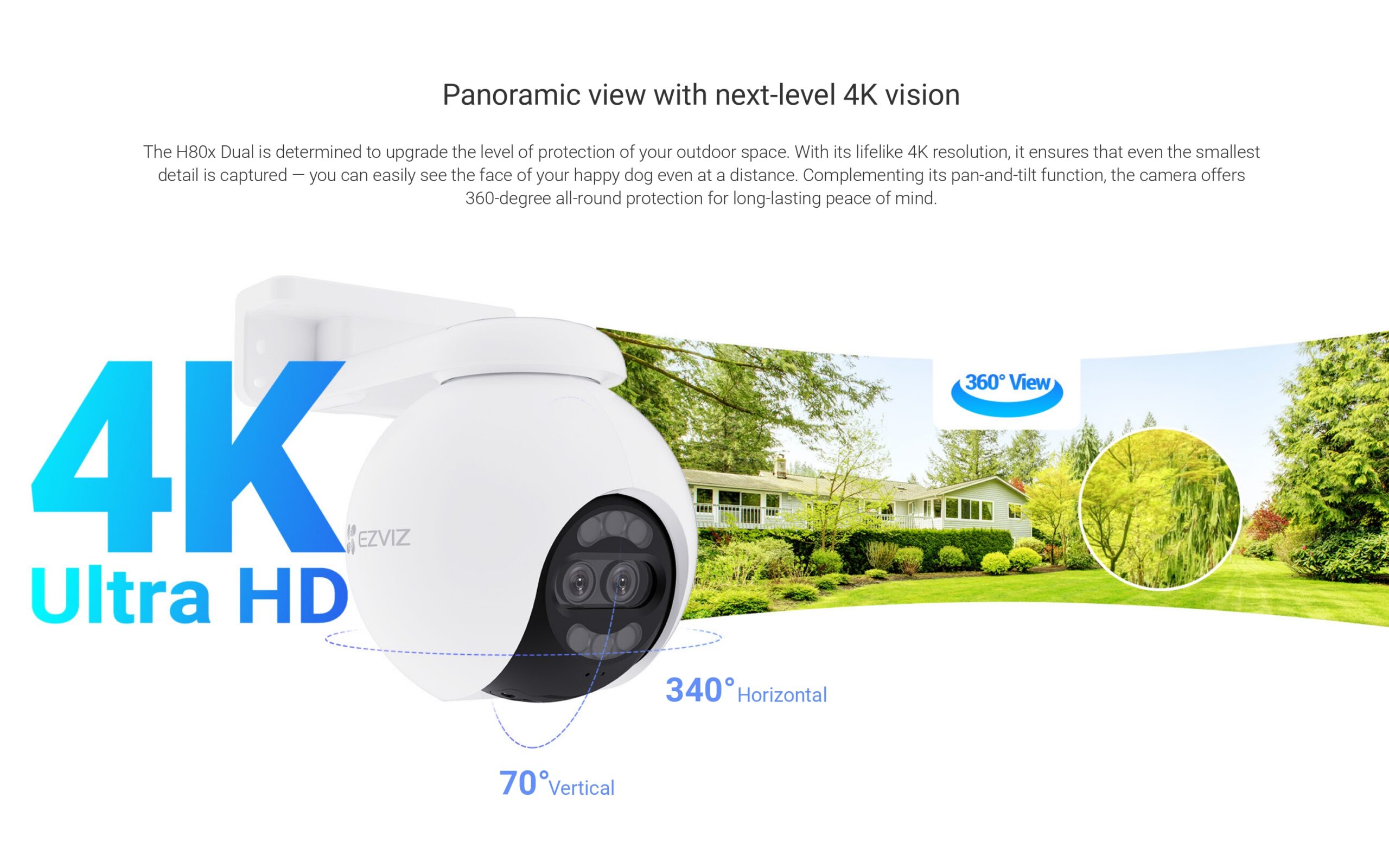 تعتبر EZVIZ H80x Dual كاميرا أمنية خارجية متطورة توفر مراقبة عالية الدقة وقدرات رؤية ليلية معززة. تتميز بمعالجة صور عبر عدسات مزدوجة، مما يمنح دقة 4K فائقة الوضوح مع فتحة عدسة واسعة جداً F1.0، مما يسمح بأداء فائق في ظروف الإضاءة المنخفضة.