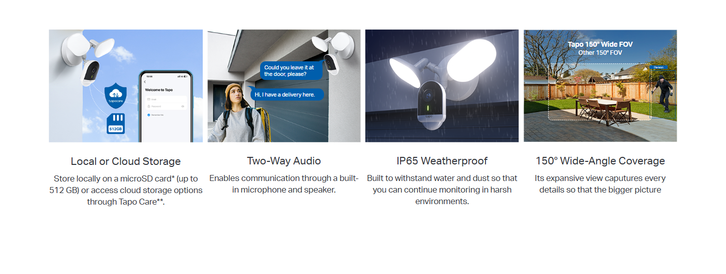 تخزين محلي أو سحابي: احفظ مقاطع الفيديو محلياً على بطاقة microSD (حتى 512 جيجابايت) أو عبر خدمة Tapo Care للتخزين السحابي للوصول إليها في أي وقت.