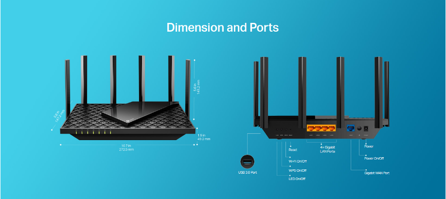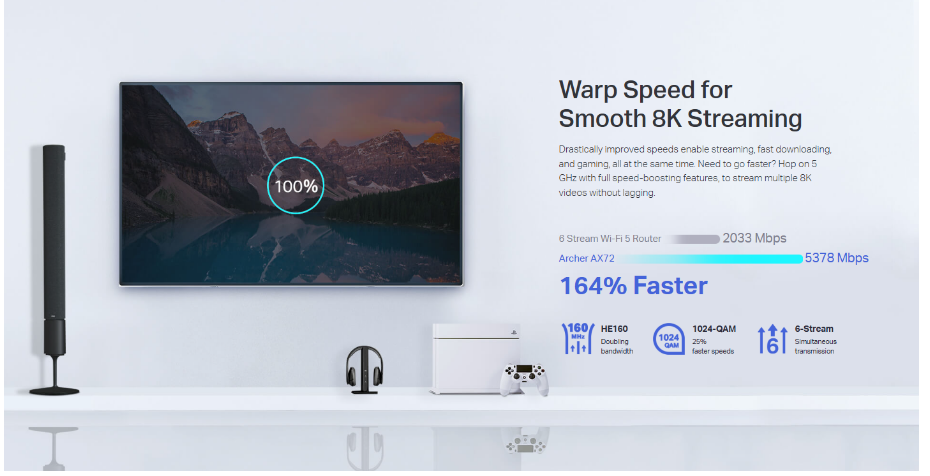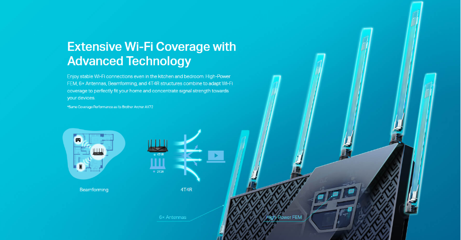 واي فاي ثلاثي النطاق (Tri-Band): يوفر سرعات إجمالية هائلة تصل إلى 5400 ميجابت/ثانية، مما يضمن أداءً فائقاً لجميع أجهزتك في وقت واحد.