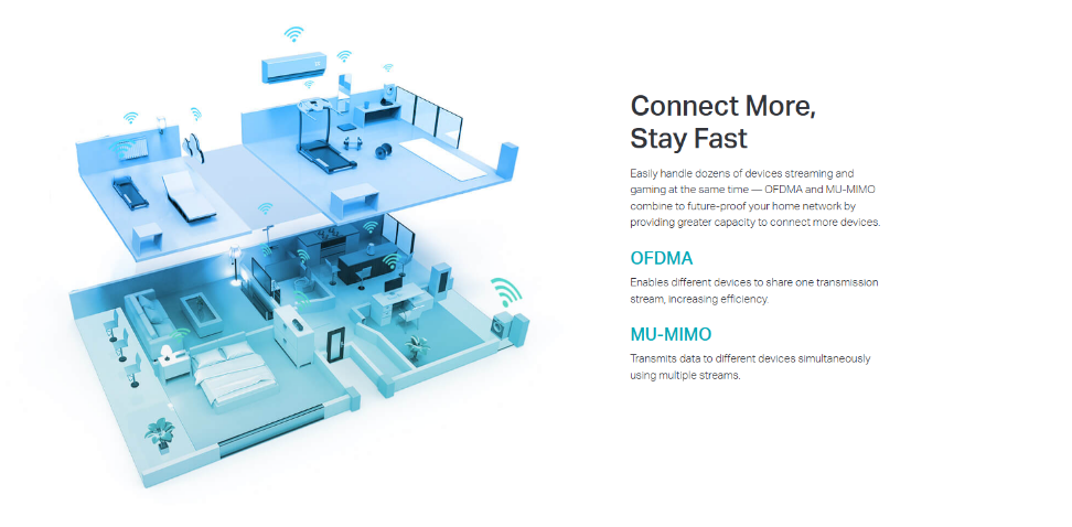 توصيل أجهزة أكثر (OFDMA): تزيد تقنية OFDMA من سعة الشبكة بمقدار 4 مرات، مما يسمح بنقل البيانات لعدد أكبر من الأجهزة في وقت واحد دون بطء.