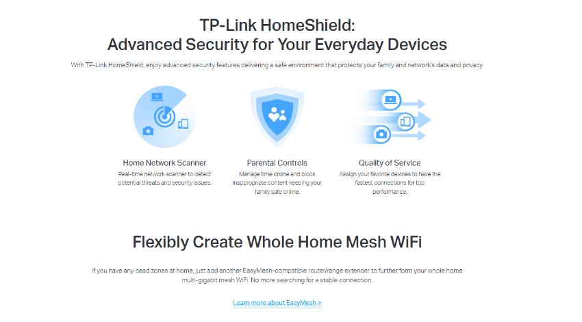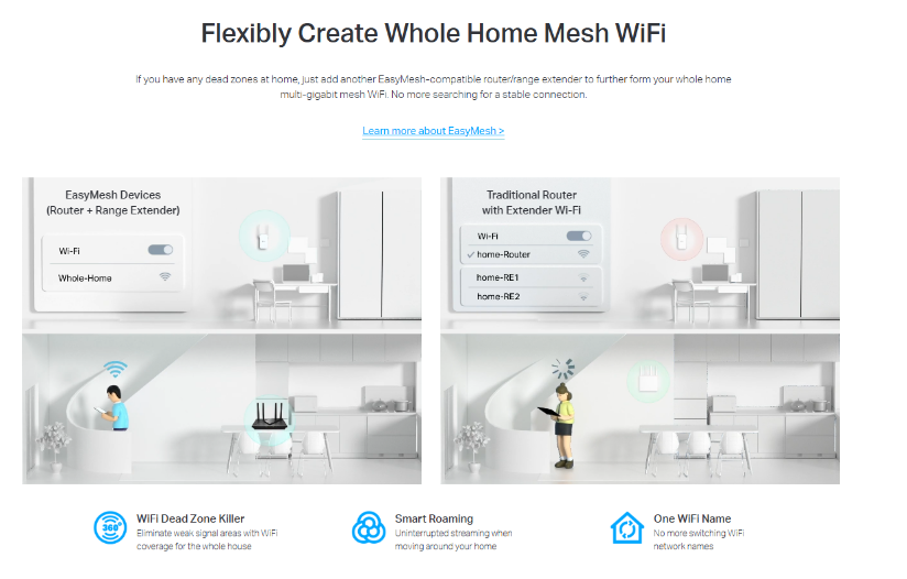 دعم OneMesh™: يتيح لك إنشاء شبكة Mesh موحدة عند توصيله بمقوي إشارة يدعم OneMesh لتغطية كل ركن في منزلك.