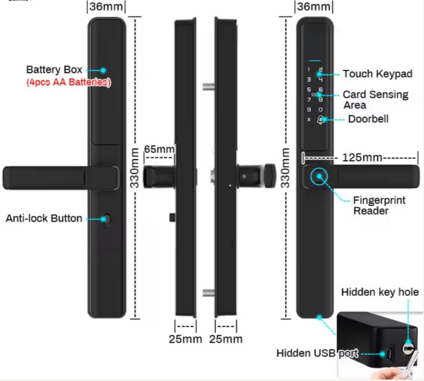 🔋 مدخل طاقة للطوارئ: مزود بمنفذ USB خارجي لتشغيل القفل في حال نفاذ البطاريات تماماً لضمان عدم الانحباس بالخارج