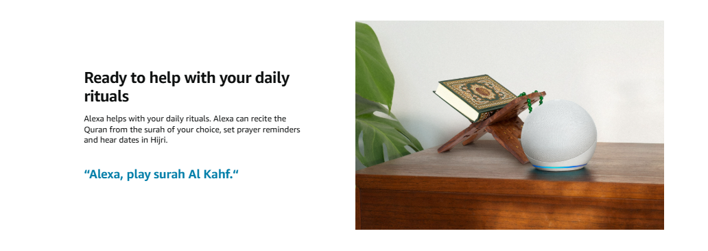 : Uses Alexa to play music, recite the Holy Quran, set alarms, and more.