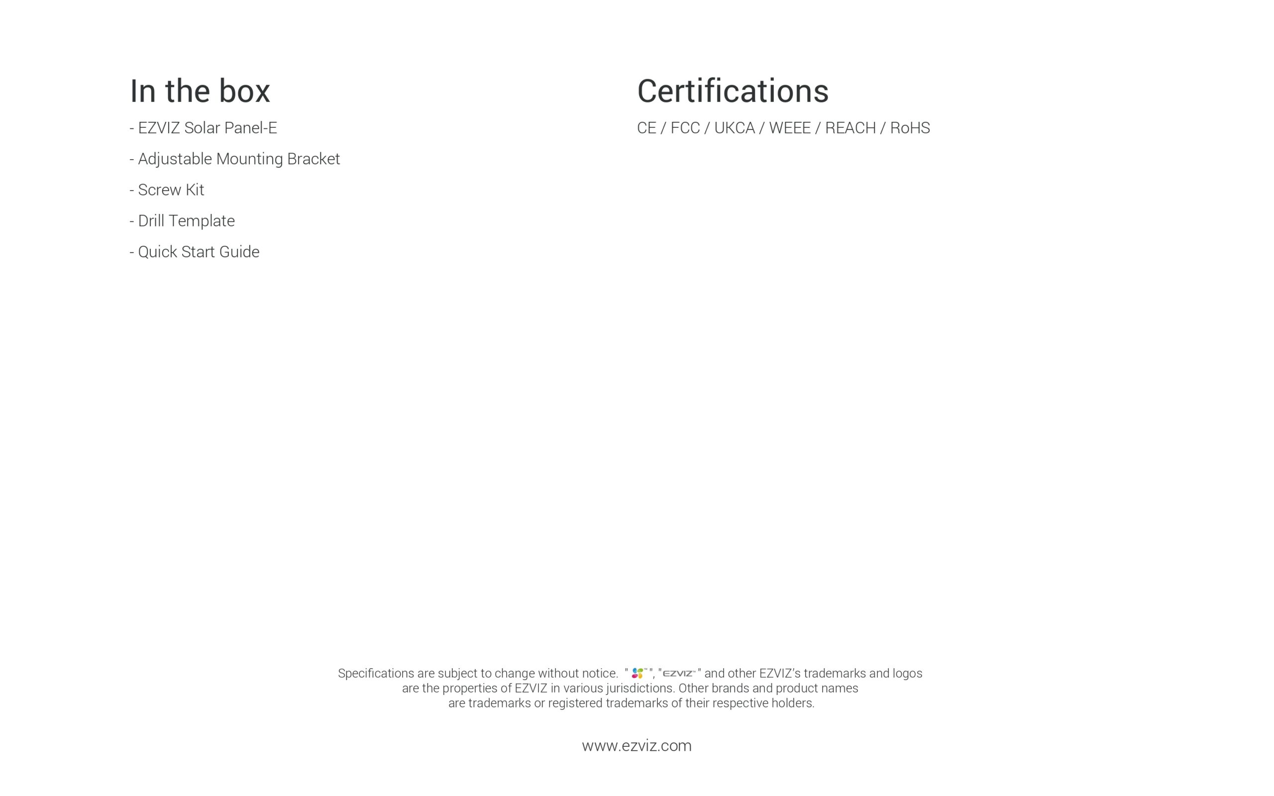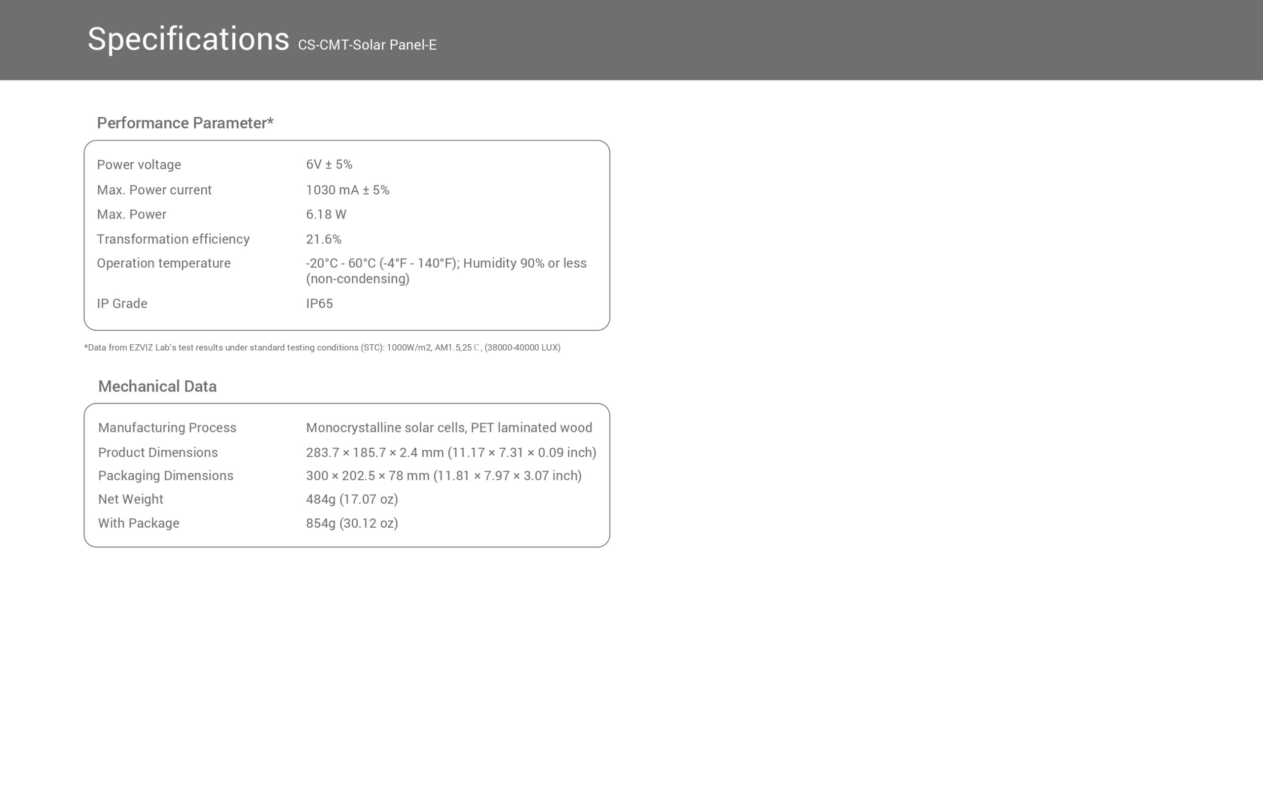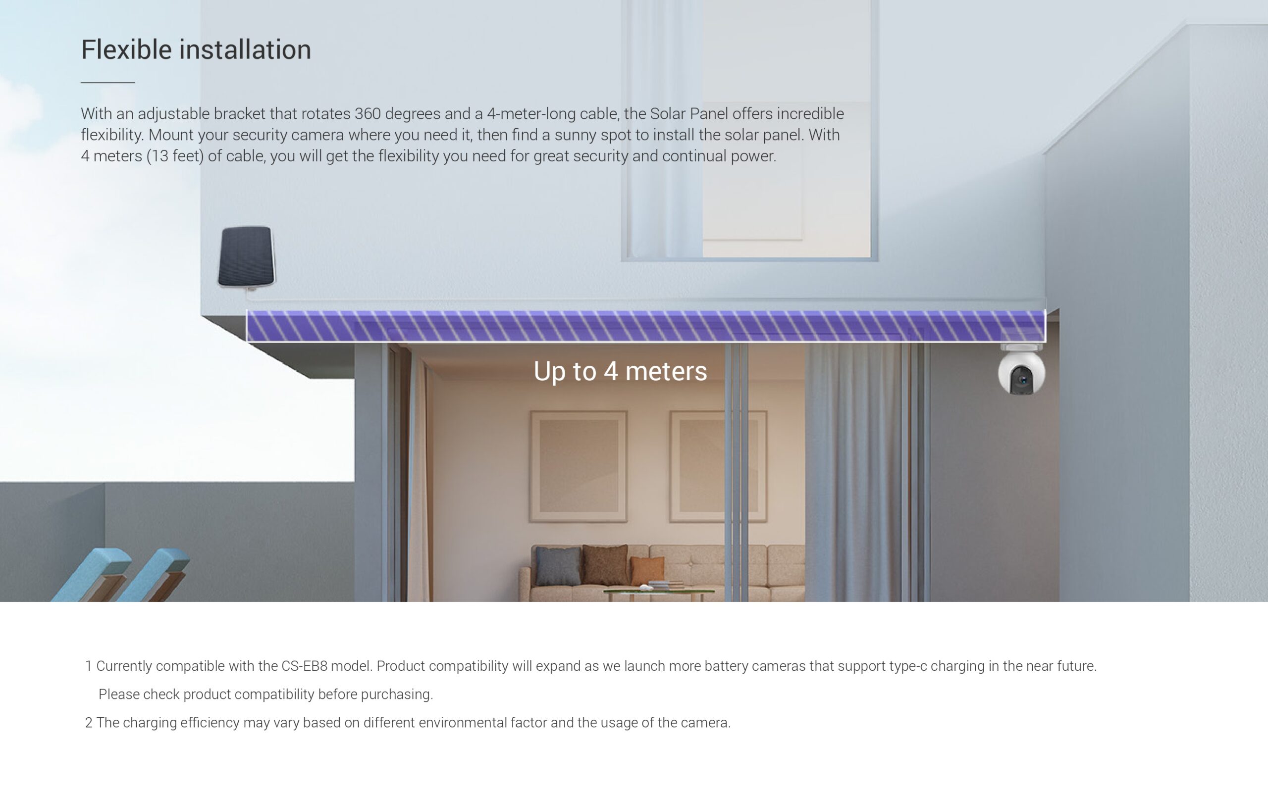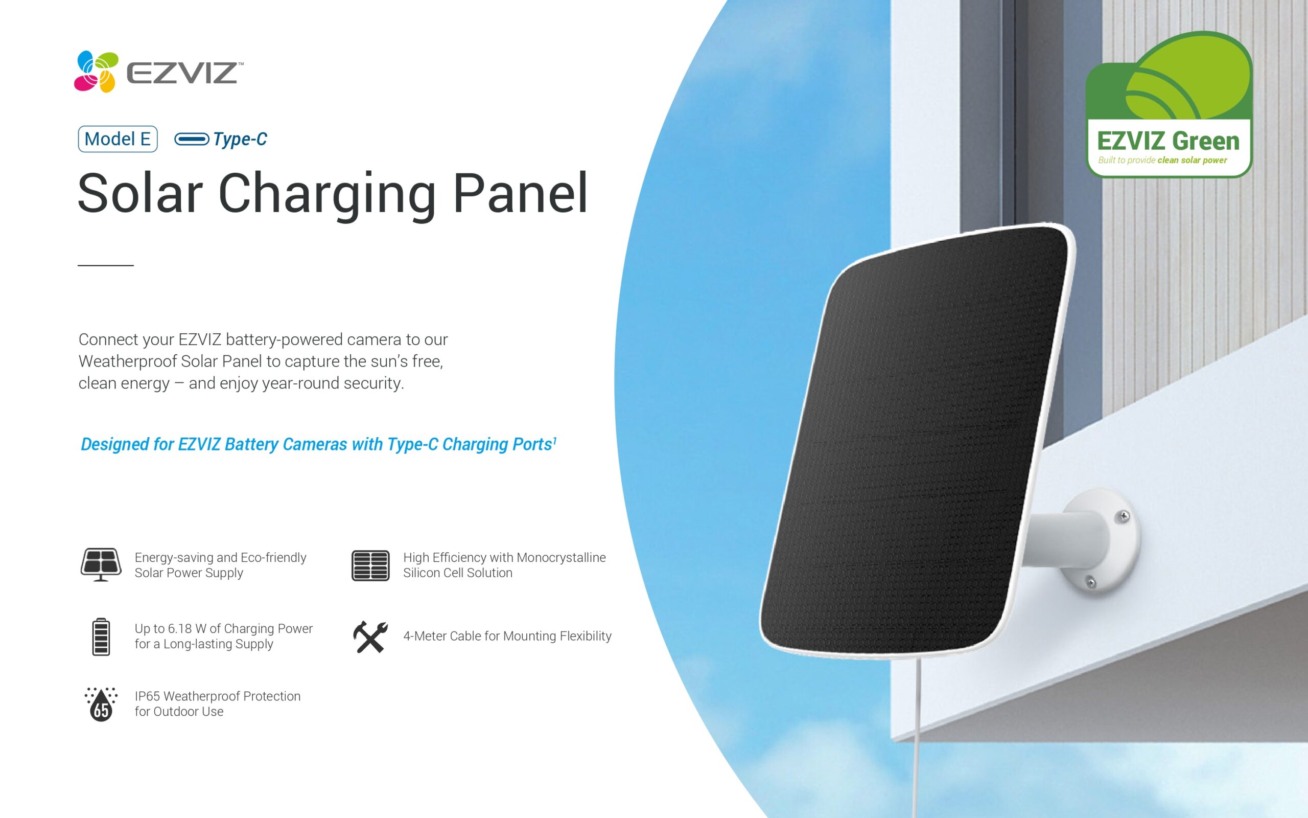 he EZVIZ CS-CMT-Solar Panel-E is a solar charging panel designed to power EZVIZ battery-powered cameras equipped with Type-C charging ports. This panel ensures the continuous operation of your security cameras by harnessing solar energy, reducing the need for frequent battery replacements or manual charging.
