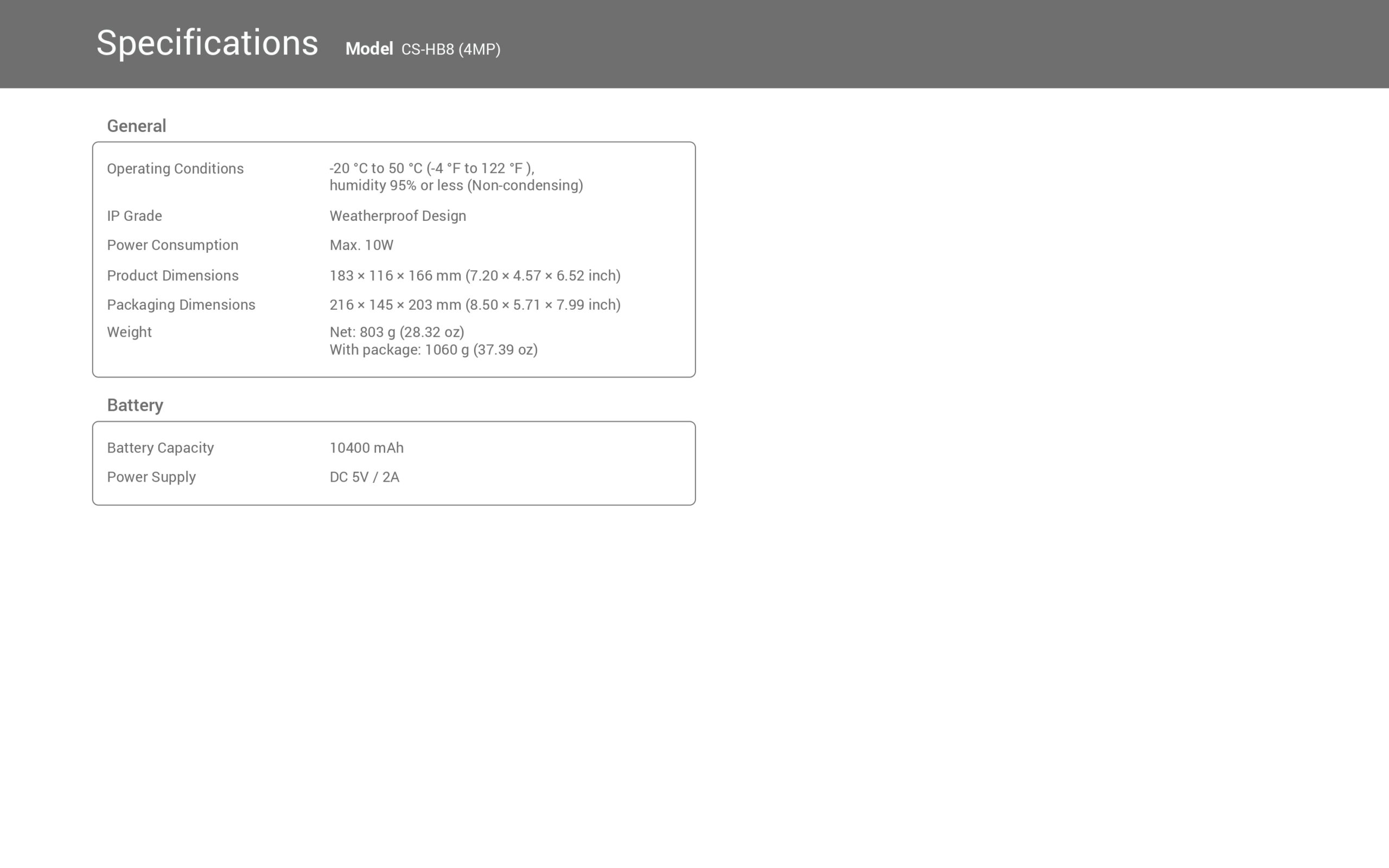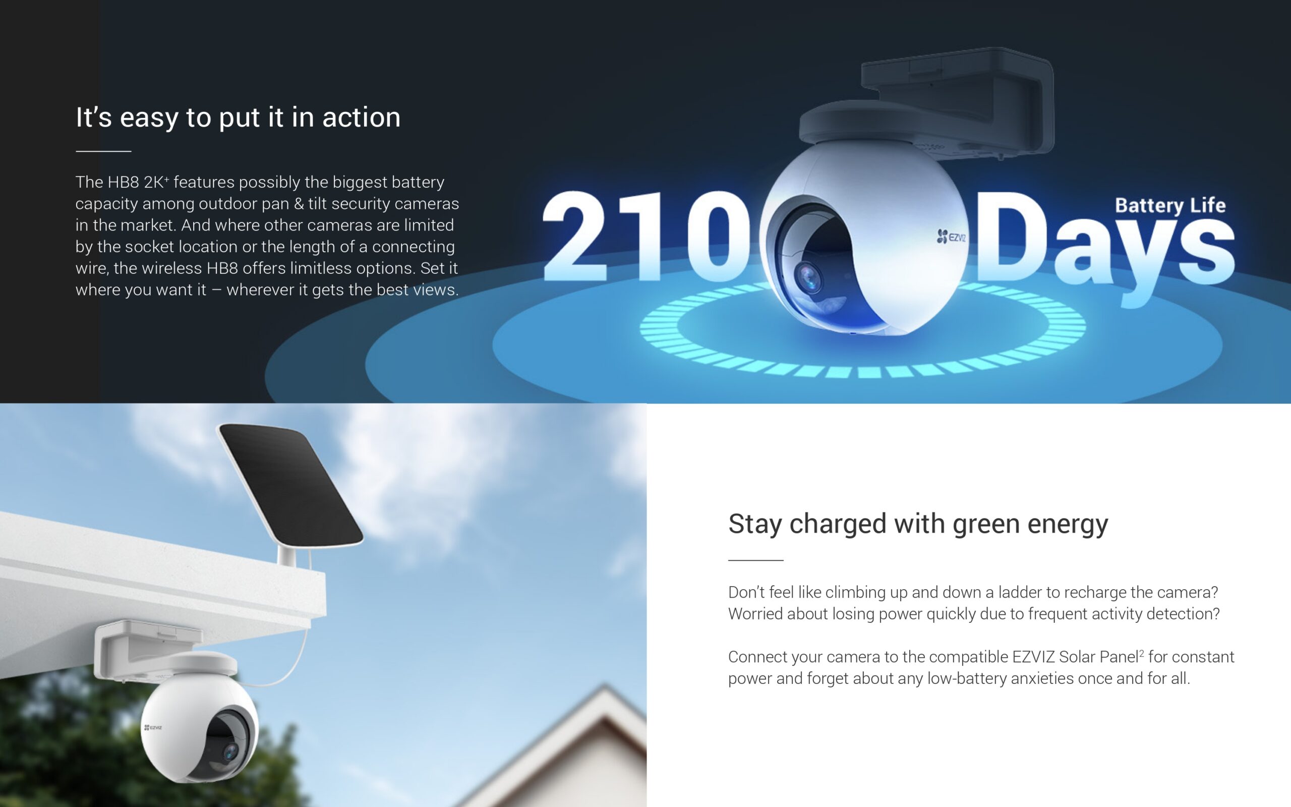 HB8 2K⁺ features possibly the biggest battery capacity among outdoor pan & tilt security cameras in the market. And where other cameras are limited by the socket location or the length of a connecting wire, the wireless HB8 offers limitless options. Set it where you want it – wherever it gets the best views.