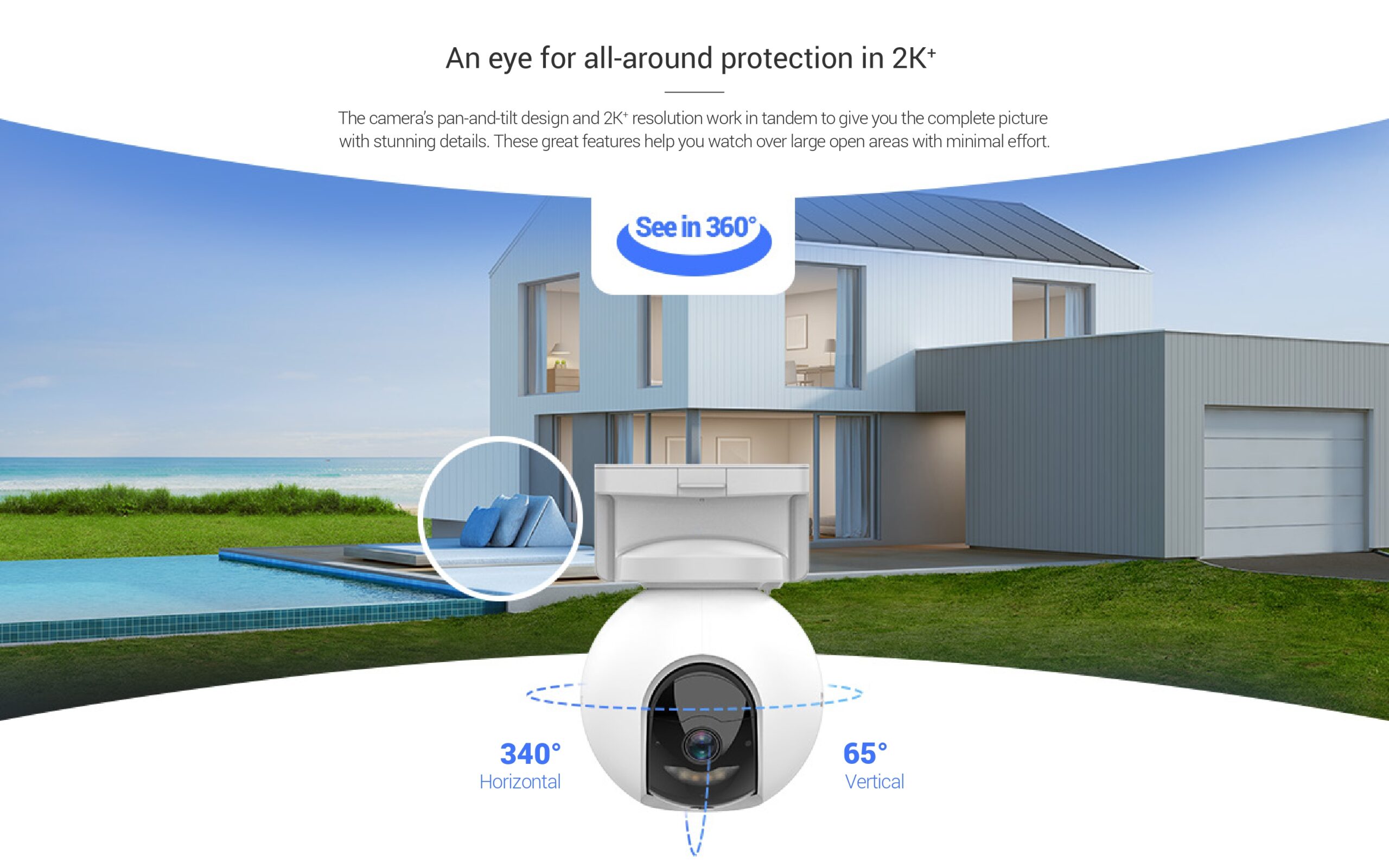 The camera’s pan-and-tilt design and 2K⁺ resolution work in tandem to give you the complete picture with stunning details. These great features help you watch over large open areas with minimal effort.