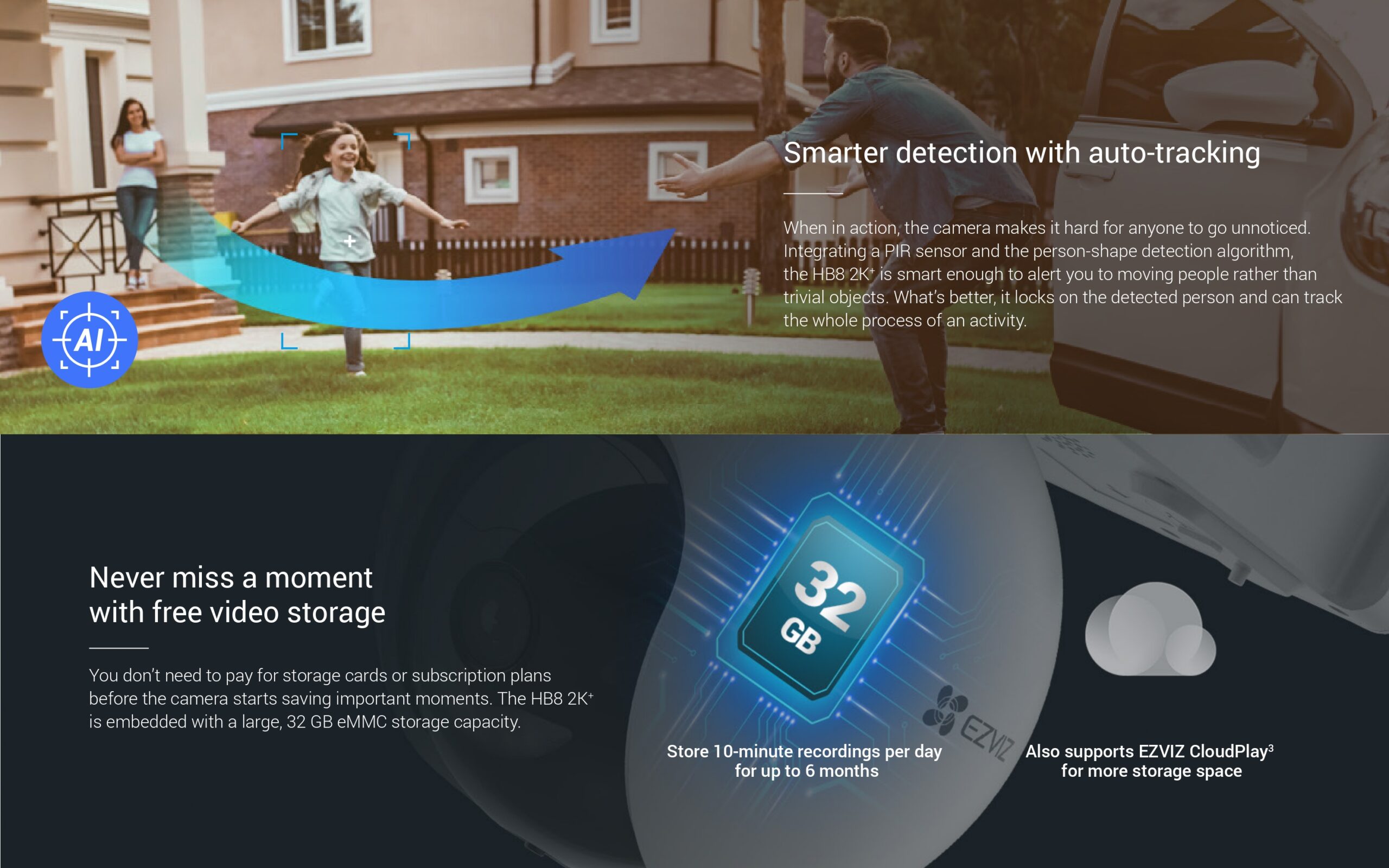 When in action, the camera makes it hard for anyone to go unnoticed. Integrating a PIR sensor and the person-shape detection algorithm, the HB8 2K⁺ is smart enough to alert you to moving people rather than trivial objects. What’s better, it locks on the detected person and can track the whole process of an activity.