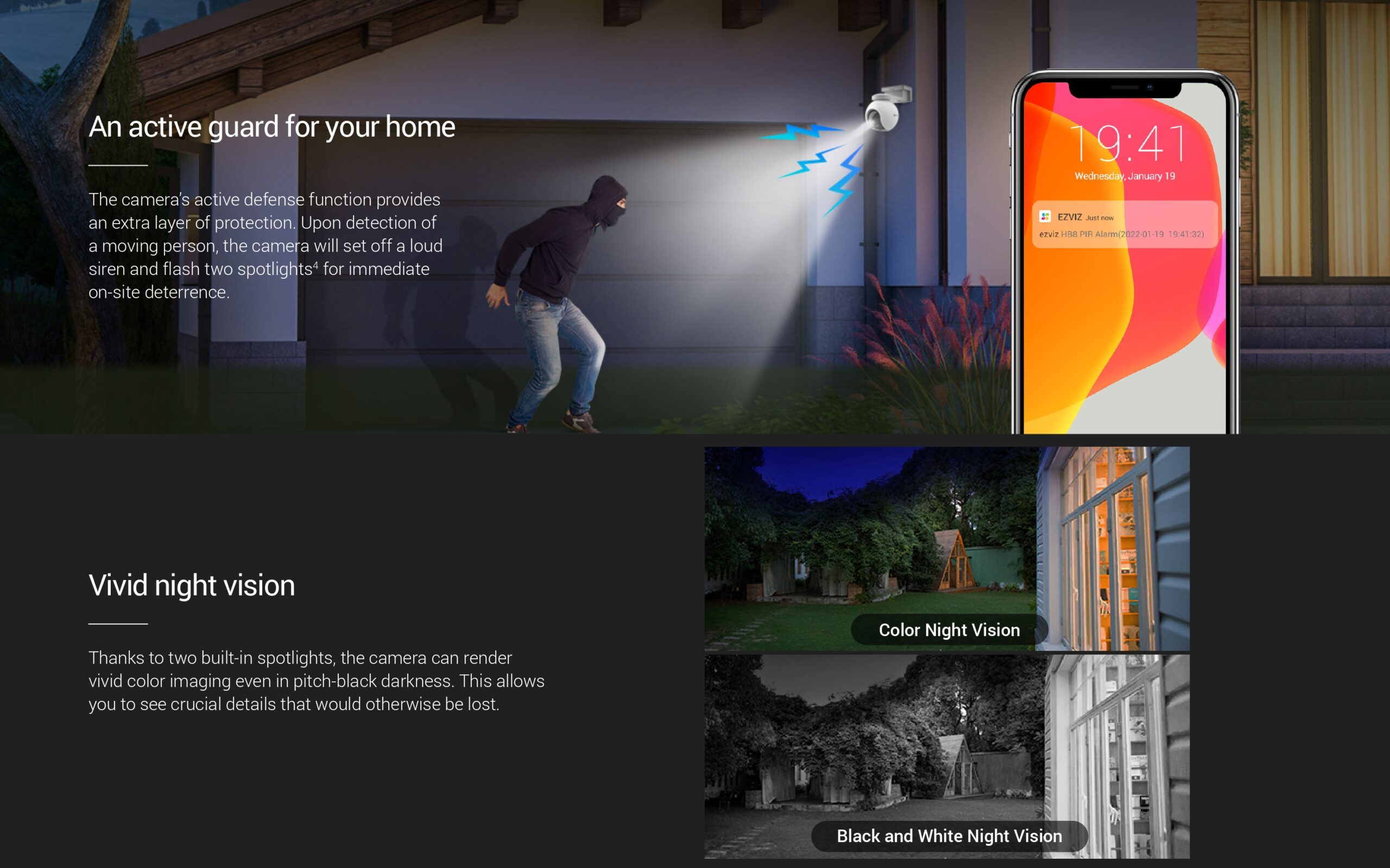 The camera’s active defense function provides an extra layer of protection. Upon detection of a moving person, the camera will set off a loud siren and flash two spotlights⁵ for immediate on-site deterrence.