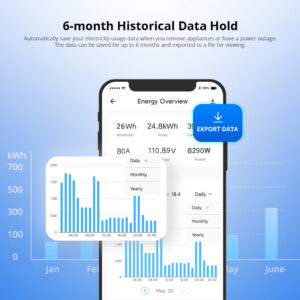 【6-month Historical Data Hold】Automatically save your electricity usage data when you remove appliances or have a power outage. The data can be saved for up to 6 months and exported to a file for viewing.