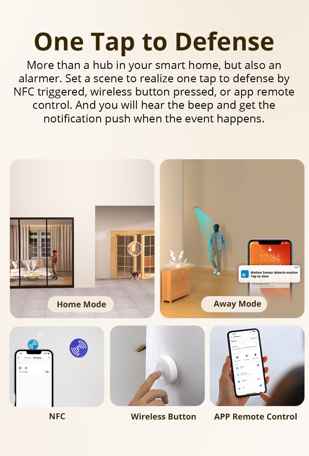 【Smart Home Security】This bridge can be used as an alarm. Set a smart scene to realize one tap to defense by NFC triggered, wireless button pressed, or app remote control. And you will hear the beep and get the notification push when the event happens.