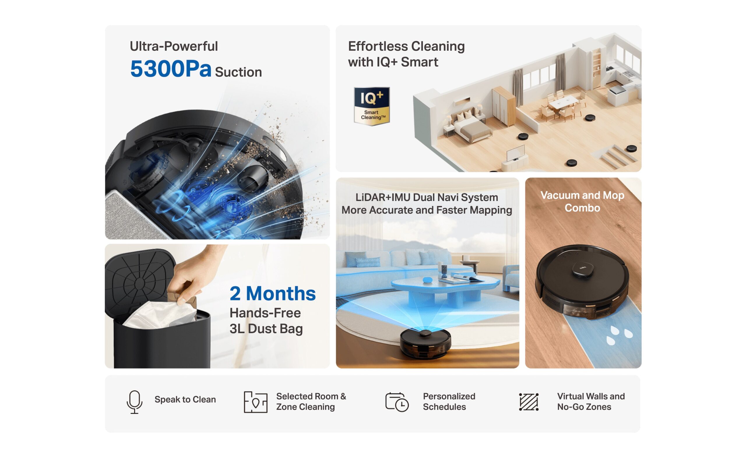 Customizable Cleaning – Merge and separate areas, set a cleaning schedule, and customize clean modes for each room.