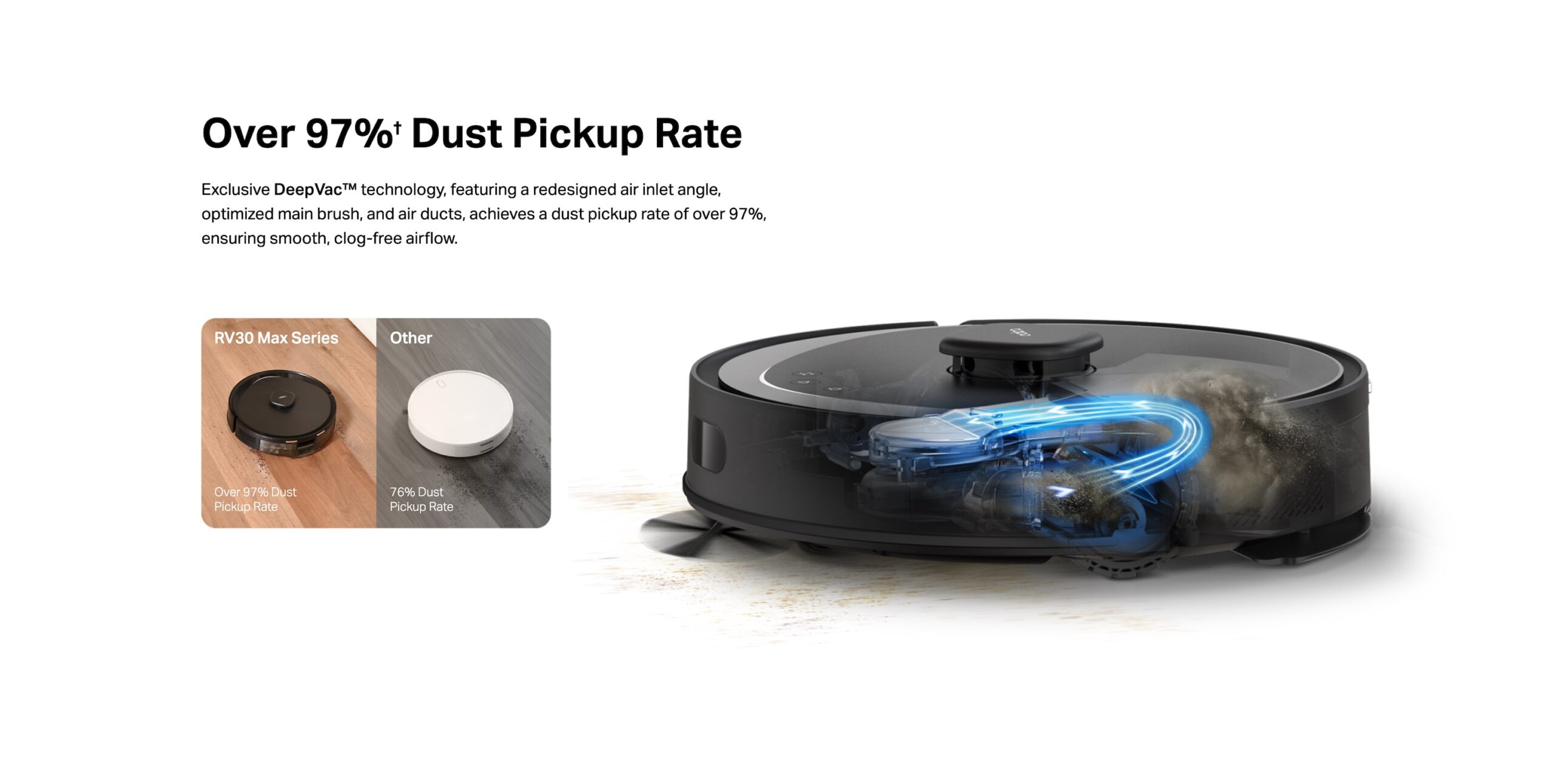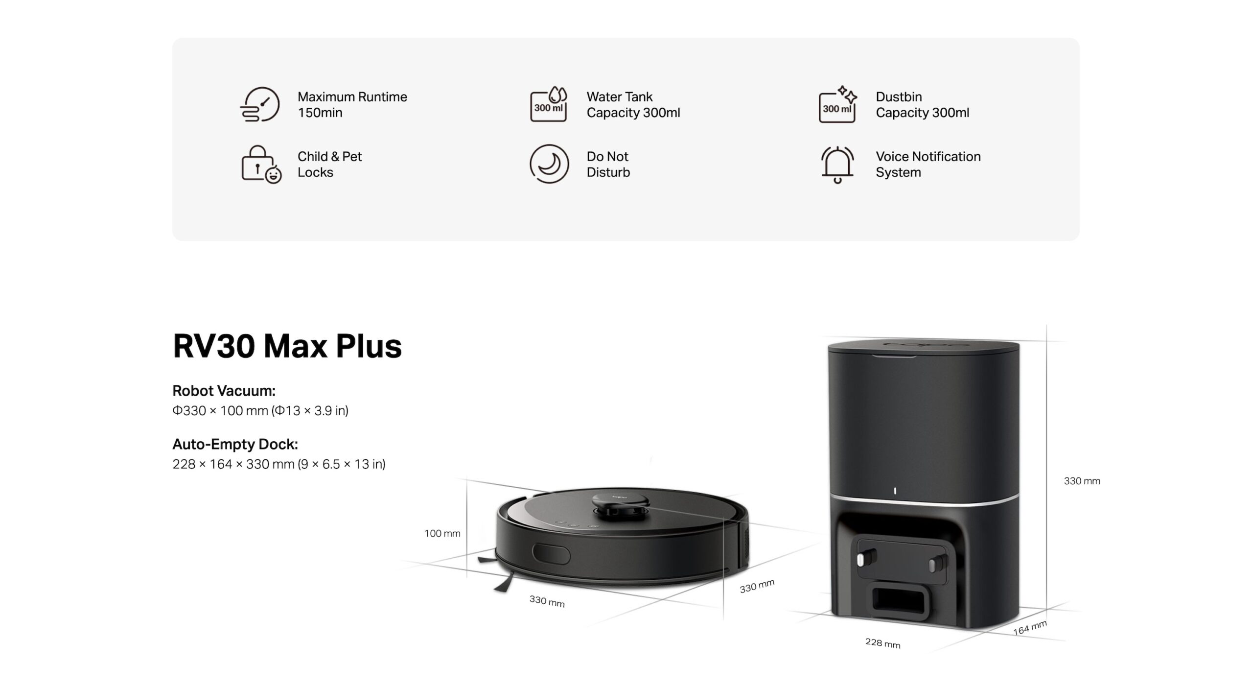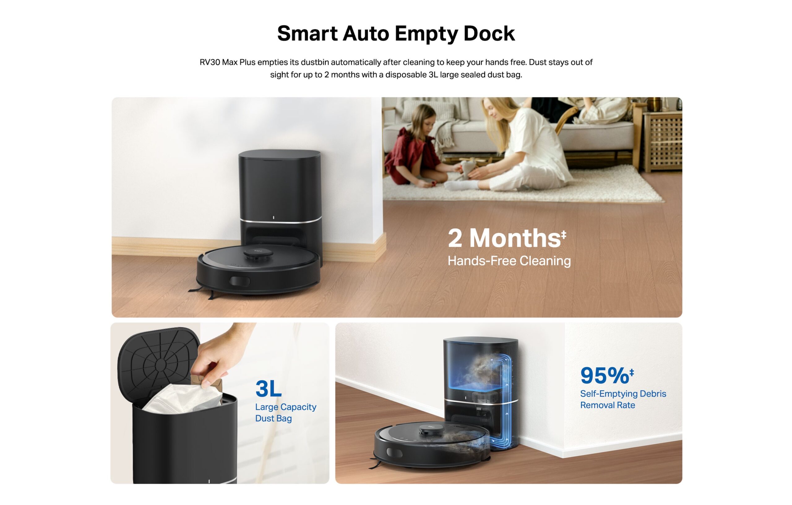 Auto-Empty with 3L Large Dust Bag – Dust stays out of sight for up to 2 months with a disposable 3L large sealed dust bag.
