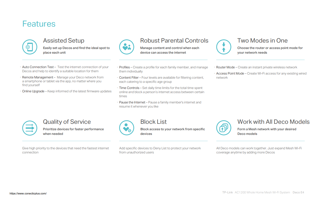 Expandable Coverage: The Deco E4 three-pack delivers Wi-Fi to an area of up to 4,000 square feet (EU version). Need more? Simply add more Deco units to the network at any time to increase coverage.