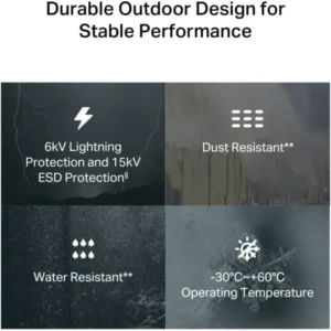 Durable Outdoor Design: Features an IP65 weatherproof rating, with ±6 kV lightning protection and ±15 kV ESD (electrostatic discharge) protection.