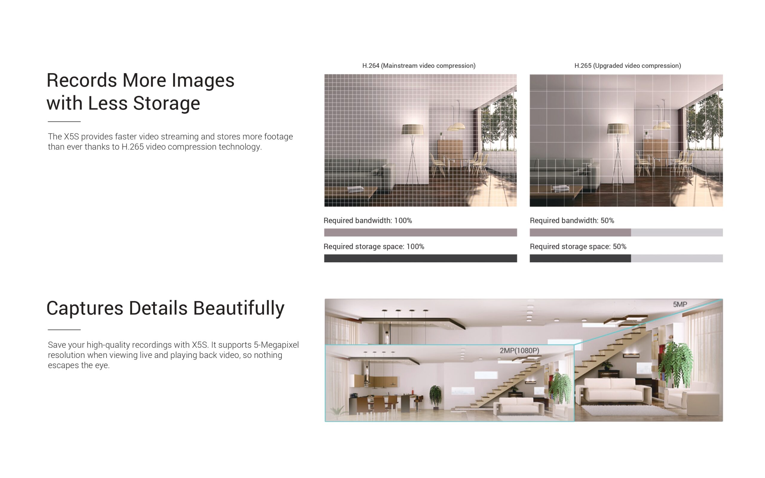 - Advanced Video Compression: Utilizing H.265 video compression technology, the X5S provides faster video streaming and stores more footage than previous models. This technology reduces required bandwidth and storage space by up to 50% compared to the older H.264 standard.