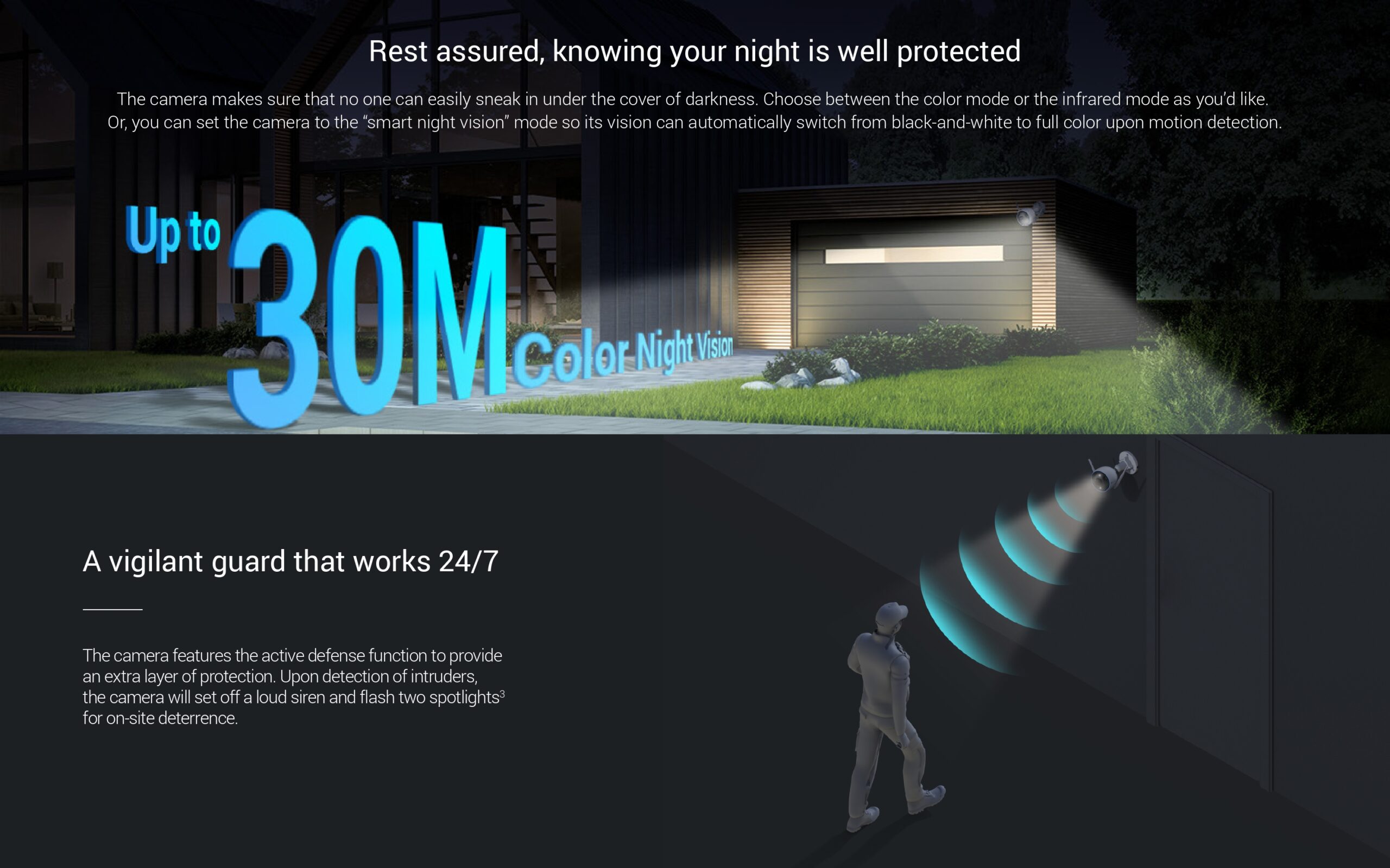 دفاع نشط بصافرة إنذار وضوء متقطع: ردع فوري للمتسللين باستخدام الصوت والضوء.